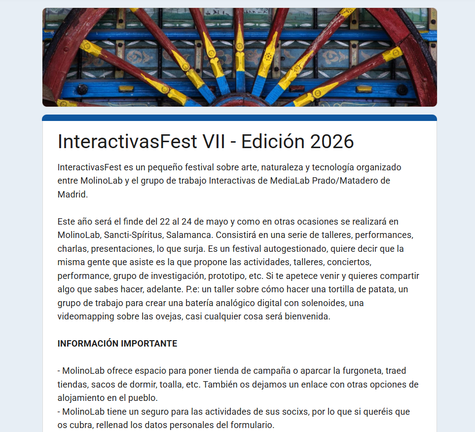 Del 22 al 24 de mayo, MolinoLab (Sancti-Spíritus, Salamanca) acoge una nueva edición de InteractivasFest, un pequeño festival organizado entre MolinoLab y el grupo de trabajo Interactivas de MediaLab Prado / Matadero Madrid.
